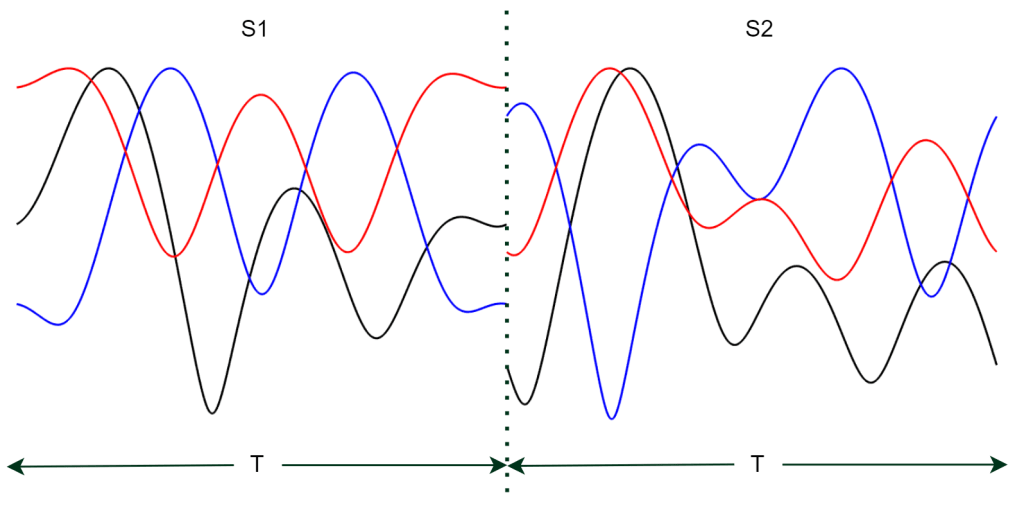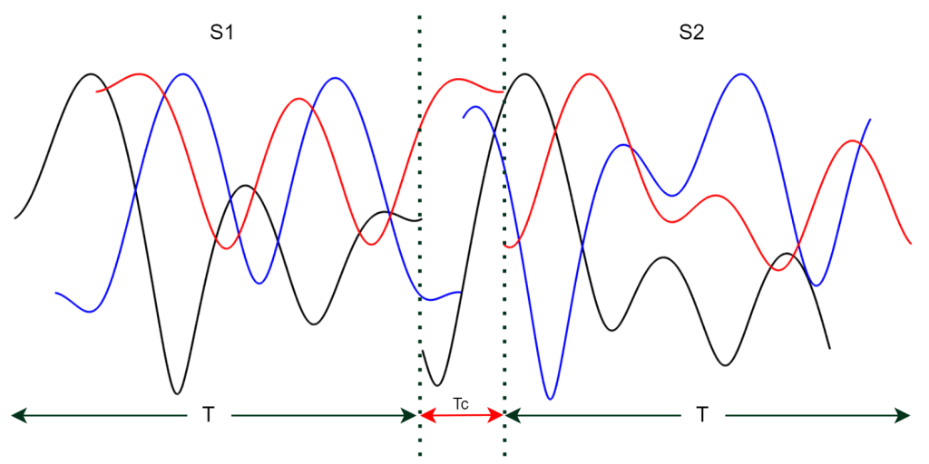Since path A and path C are longer than path B, the received signals taking those paths will be delayed compared to the signal that traveled path B. Since path A is the longest path, it will arrive last. As mentioned in the diagram below, the difference between path A (black) and path C (red) is Tc seconds. Now, these copies of the signal (blue & red) carrying S1 overlaps with the signal carrying S2. This overlap is called Inter Symbol Interference (ISI). Delayed copies of the first symbol/signal carrying S1 interfered with the symbol/signal carrying S2. The orthogonality of the signals will be partially lost. This interference corrupts the last samples of S1 and the initial samples of S2. Following is the illustration: