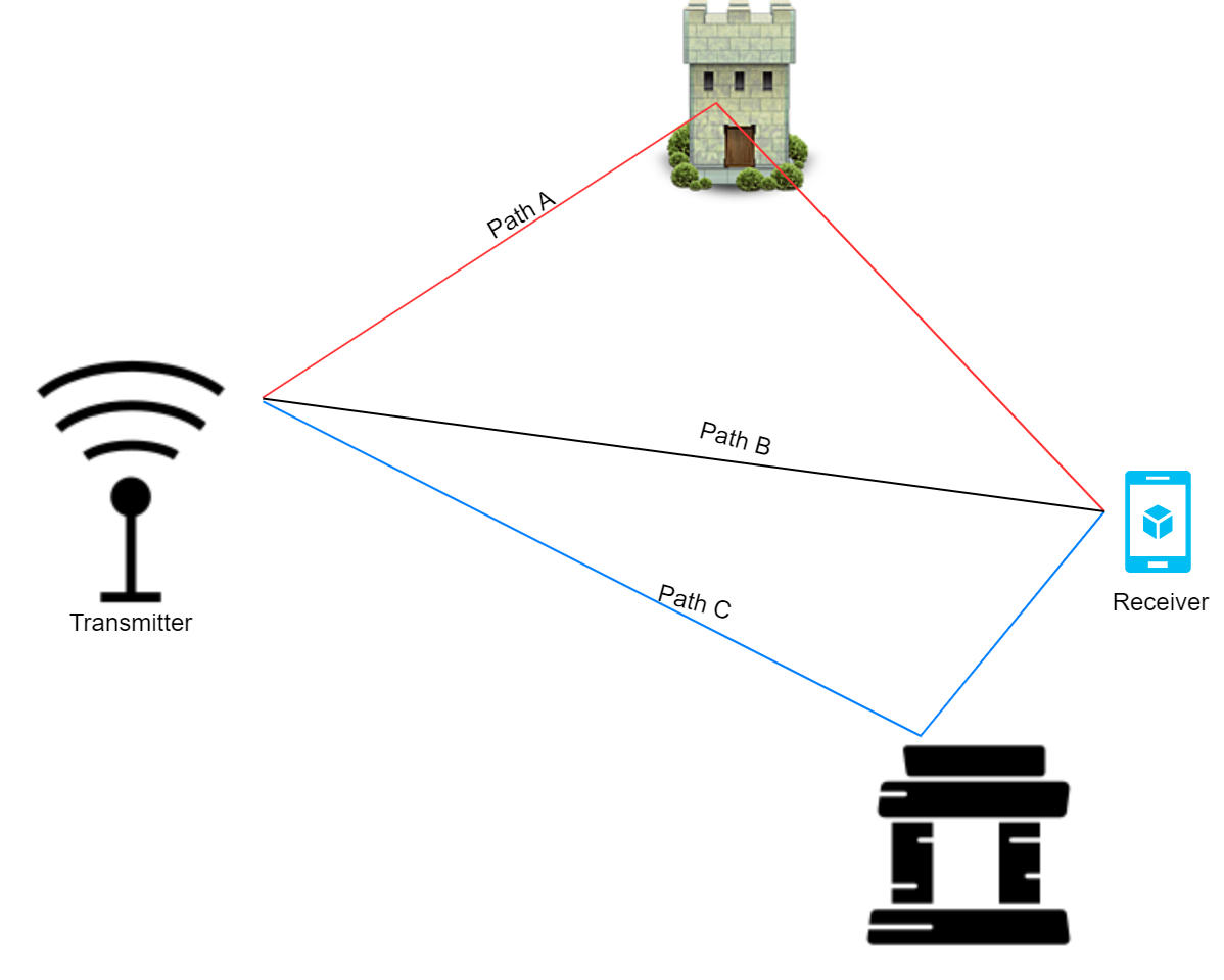 From the above scenario, the receiver receives 3 copies of the transmitted signal. All 3 copies of the signal travel 3 different paths (paths A, B, and C). The distance each signal copy travels before they reach the receiver is different. For the above scenario let’s assume path A > path C > path B.